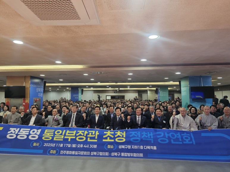 정동영 통일부 장관, 성북구서 정책 강연 “남북교류, 작은 인적교류부터… 평화가 통일의 출발점” 500여 명 참석… 민주평통·통합방위협의회 공동 주최 ▲정동영 통일부 장관, 성북구서 정책 강연 기념사진 (시사프리신문=정진만 기자) 민주평화...