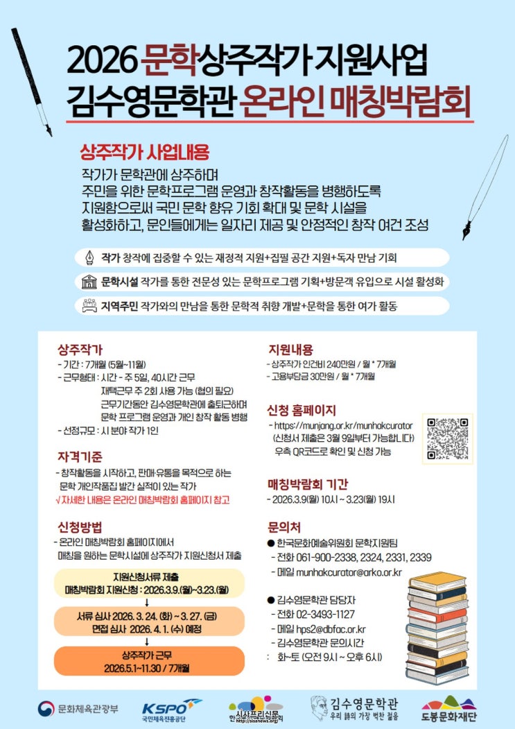 김수영문학관, 2026년 문학상주작가 지원사업 참여 작가 공모 도봉구(구청장 오언석) 도봉문화재단 김수영문학관이 ‘문학상주작가 지원사업’에 참여할 상주 작가를 모집한다고 밝혔다. 2026 문학상주작가 지원사업은 작가가 문학관에 상주하며 주민을 위한 ...