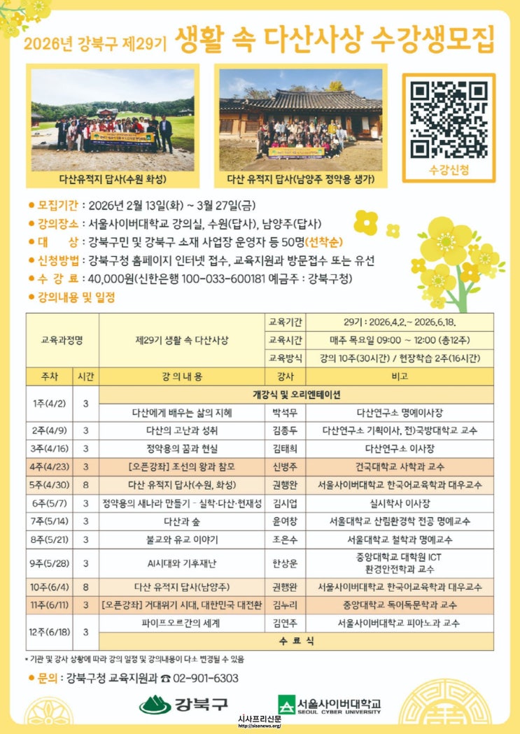 강북구, ‘생활 속 다산사상’ 인문학 강좌 수강생 모집 4월 2일 개강, 12주 과정… 강북구민 50명 선착순 모집 강북구(구청장 이순희)는 다산 정약용의 사상과 인문학적 가치를 생활 속에서 쉽게 접할 수 있도록 ‘제29기 생활 속 다산사상’ 수강생을 모...