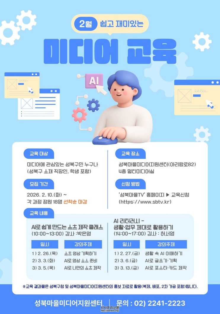 성북마을미디어지원센터, AI활용 미디어교육 수강생 모집 2월 10일부터 AI활용 미디어 교육 수강생 선착순 모집 성북마을TV 누리집에서 신청, 성북마을미디어지원센터에서 교육 진행 성북구 성북마을미디어지원센터가 2월 10일부터 AI 활용 미디어 교육...