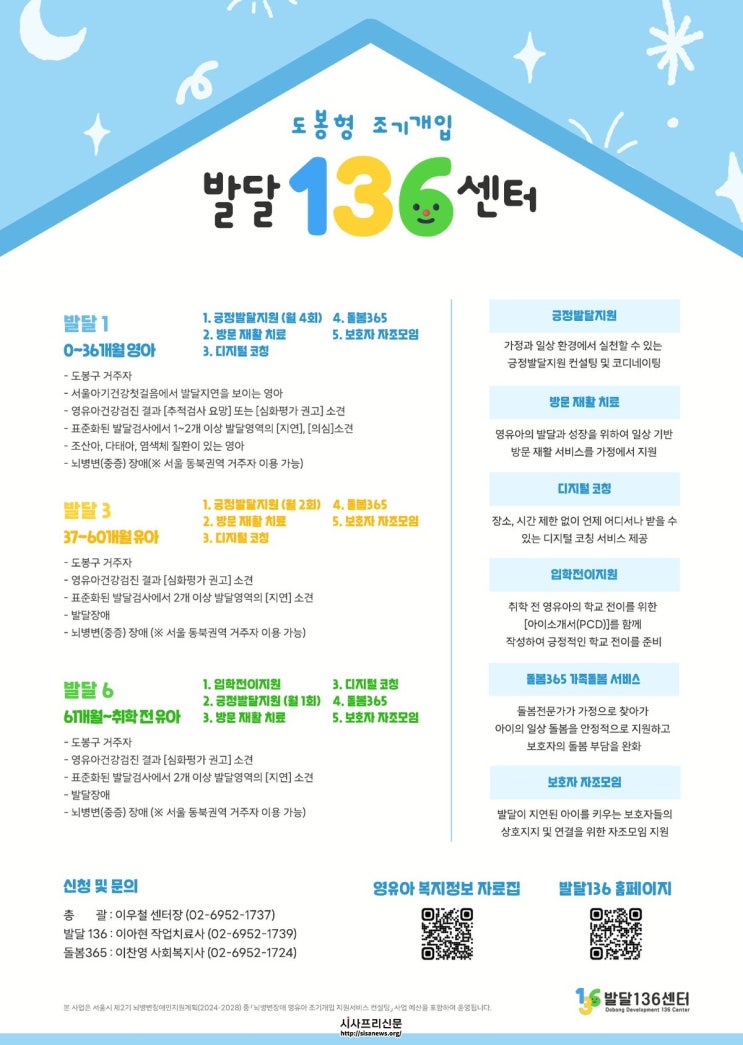 도봉구, 생애주기 맞춤형 조기개입 ‘발달 136 사업’ 추진 영유아 발달 시기별 3단계로 나눠 지원 물리치료 등 찾아가는 방문재활 핵심 도봉구(구청장 오언석)가 미취학 영유아를 대상으로 생애주기 맞춤형 조기개입 ‘발달 136 사업’을 추진한다. ...
