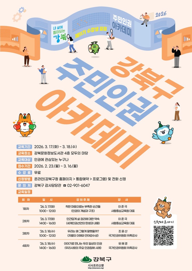 강북구, 일상에서 만나는 주민 인권아카데미 운영 누구나 참여하는 열린 인권교육… 3월 16일까지 선착순 접수 생활 속 인권 감수성 높이는 실천 중심 프로그램 구성 강북구(구청장 이순희)는 생활 속 인권 존중 문화를 확산하고 인권 친화적 지역사회를 조성하...