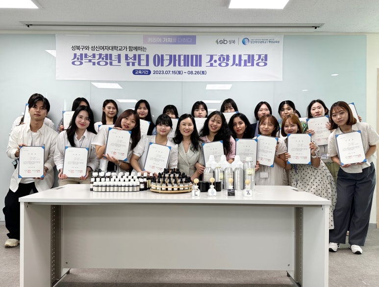 성북구 청년 뷰티 아카데미, K-뷰티 조향 분야 청년인재 배출 ‘성북’을 주제로 한 조향 프로젝트로 맞춤형 향수, 향초, 디퓨저 제작 성북구(구청장 이승로)와 성신여자대학교(총장 이성근)가 협력하여 K-뷰티 인재를 양성하고 청년 취‧창업을 지원하기 위해 운영한 「성...