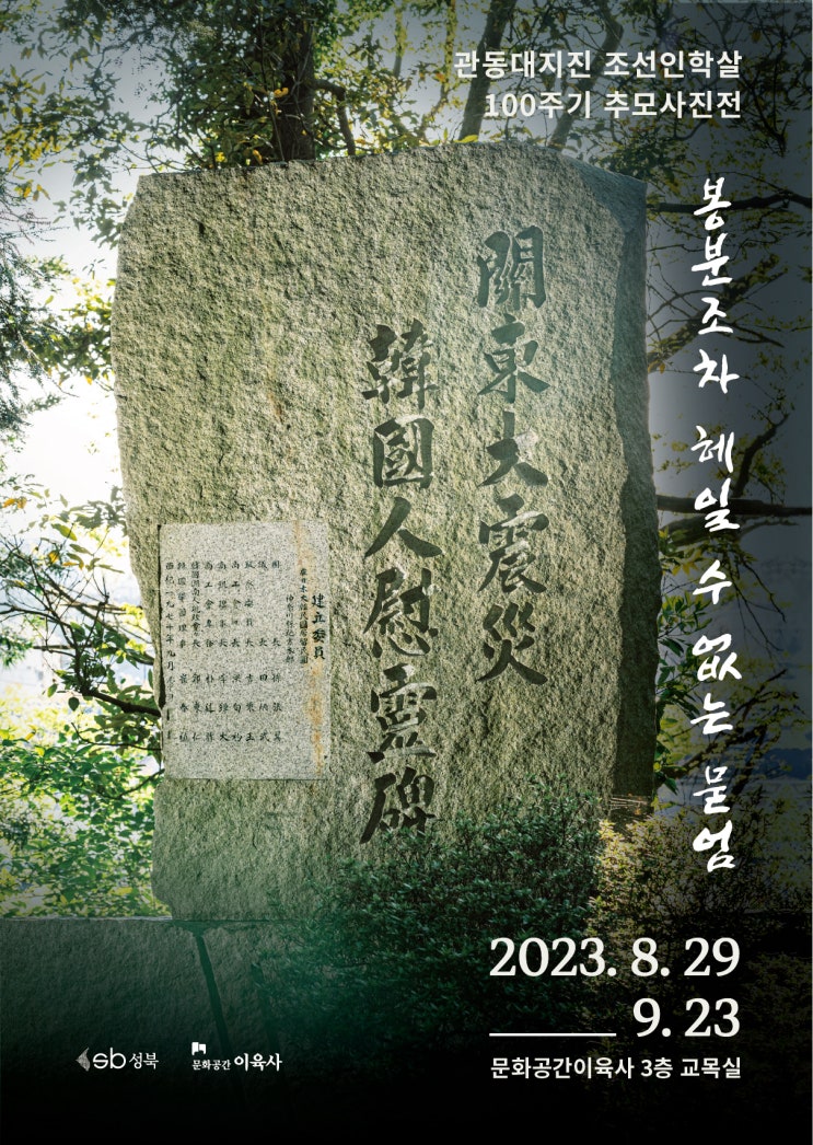 성북구, 관동대지진 조선인 학살 100주기 추모 사진전 개최 8. 29.(화) ~ 9. 23.(토), ‘문화공간이육사’에서 관동대지진 조선인 학살 100주기 맞이해 「봉분조차 헤일 수 없는 묻엄」 추모 사진전 열려 성북구(구청장 이승로)가 관동대지진 조선인 학...
