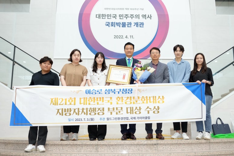 이승로 성북구청장, 대한민국 환경문화대상 대상 수상 제21회 대한민국 환경문화대상 시상식에서 지방자치행정 부문 대상 수상 성북구(구청장 이승로)가 ‘제21회 대한민국 환경문화대상’에서 지방자치행정 부문 대상을 수상했다. 올해로 21회를 맞이한 대한민국 환...