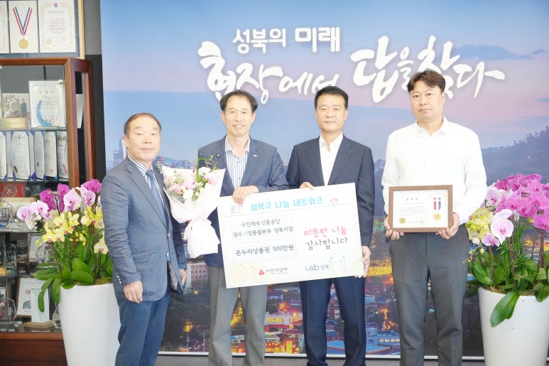 국민체육진흥공단 경주사업총괄본부 성북지점, 온누리상품권 기부 성북구(구청장 이승로)가 국민체육진흥공단 경주사업총괄본부 성북지점(지점장 이성래)에서 지난 23일에 저소득 취약계층 이웃들이 건강한 여름 나기를 위해 온누리 상품권 500만원을 기탁했다고 26일 밝혔다. ...