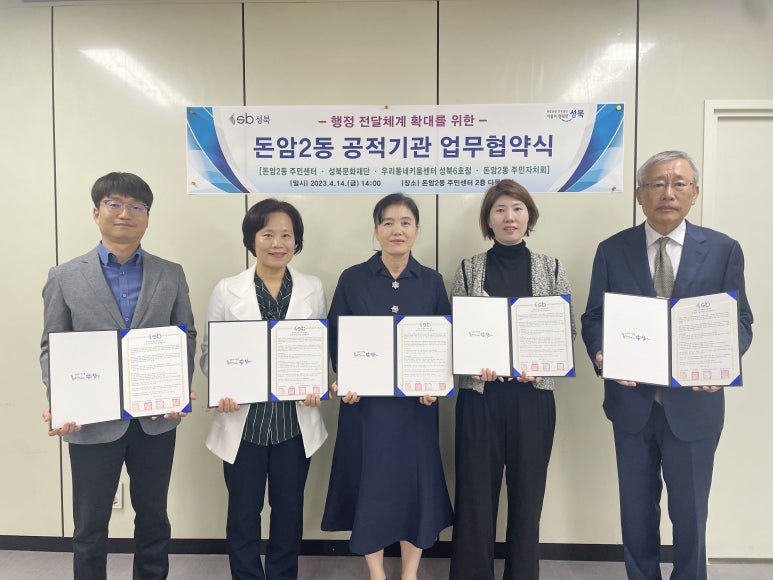 성북구, 돈암2동 공적기관 업무협약 주민의 삶을 더욱 풍요롭게 성북구 돈암2동(동장 최옥)이 동주민센터에서 지난 14일 ‘돈암2동 공적기관 업무협약식’을 개최했다. 돈암2동주민센터를 비롯한 성북문화재단, 우리동네키움센터 성북 6호점, 돈암2동 주민자치회는 행정 전달...