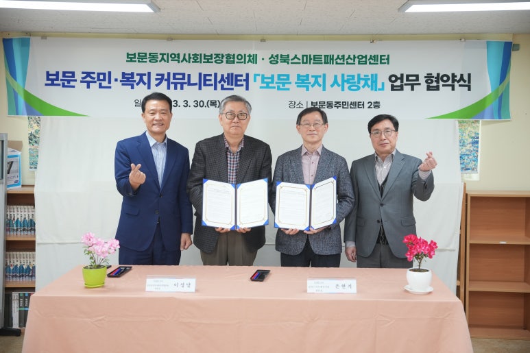 성북구, ‘보문 복지 사랑채’ 업무협약 체결 3월 30일 성북구 보문동주민센터에서 보문동지역사회보장협의체(위원장 이성달)가 ‘보문 복지 사랑채’ 운영을 위해 성북스마트패션산업센터(센터장 은현기)와 업무협약을 맺었다. 이번 업무협약으로 보문동지역사회보장협의...