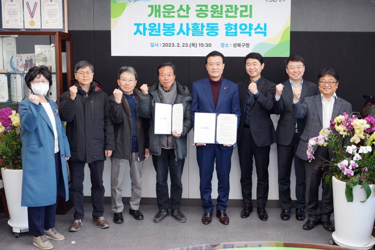 성북구, 개운산 공원관리 자원봉사활동 협약식 개최 방역패스 해제 후 개운산공원 이용수요 급증 선제적 대비 맨발걷기연대의 공원 내 환경정화 활동, 질서유지 활동 성북구(구청장 이승로)가 많은 주민이 즐겨 찾는 개운산공원의 쾌적한 유지관리를 위해 23일 개운...