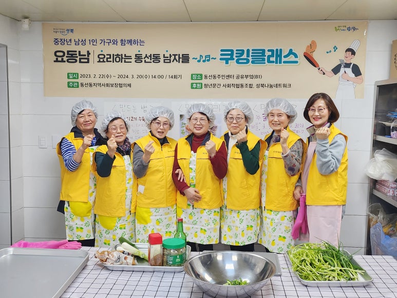 성북구 동선동, 요리하는 남자들 쿠킹클래스 개최 중장년 남성 1인가구 주민 10명 참여 성북구 동선동 주민과 청년문간이 진행하는 특별한 쿠킹클래스가 지역 중장년 남성 1인가구에게 든든한 밥심을 안기고 있다. 지난달 22일 동선동주민센터 공유부엌에서는 동...