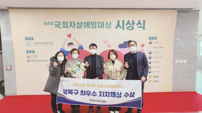 성북구, 국회자살예방대상 최우수 지자체상 서울시 최초 2년 연속 수상 #성북구(구청장 이승로)가 지난 5일 국회자살예방대상 최우수 지자체상을 수상했다. 2021년 제3회 국회자살예방대상 우수지자체 대표상 수상 이후 2회째 연속 수상이다. #국회자살예...