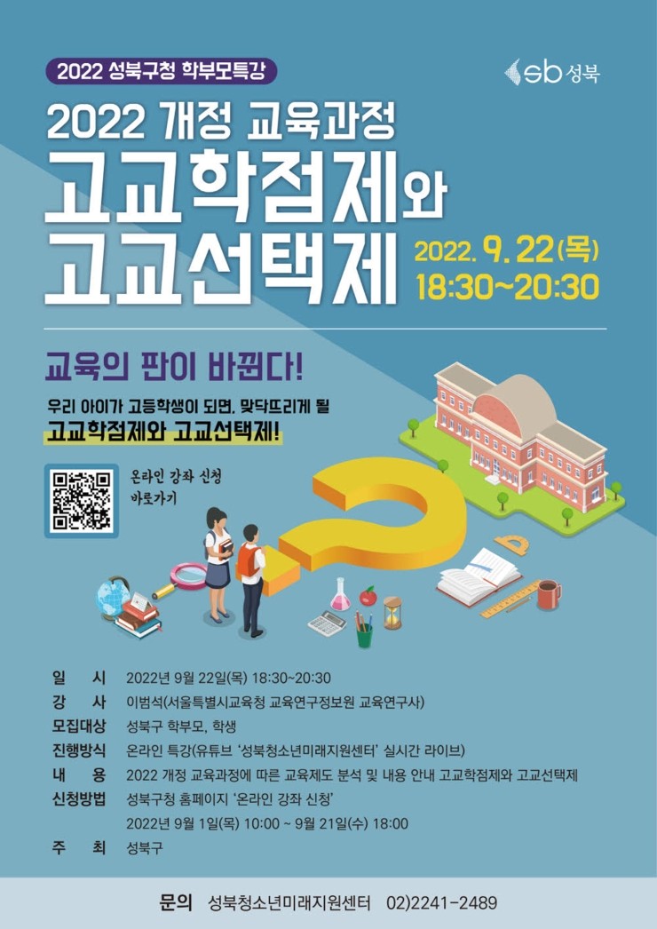 성북구(구청장 이승로)가 오는 22일 「2022 개정 교육과정 고교학점제와 고교선택제」 특강을 진행한다. 고교학점제 시행 및 새로운 고교체제 개편 방안으로 고입부터 대입까지 큰 변화를 앞둔 학부모를 위하여 이번 교육을 마련했다고 밝혔다. 최근 교...