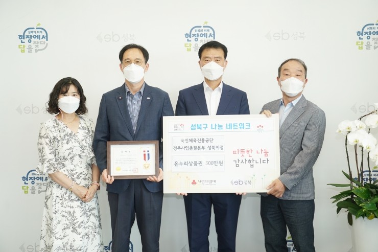 성북구(구청장 이승로)는 지난 20일 국민체육진흥공단(이사장 조현재) 경주사업총괄본부 성북지점에서 취약계층 시원한 여름나기를 위해 온누리 상품권 500만원을 기탁했다고 밝혔다. 국민체육진흥공단은 1989년 설립이후 수익금의 일부를 지역사회에 환원하는 ...