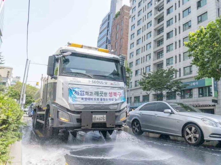 한낮 기온 30도를 넘기며 올해 들어 가장 더운 날씨가 예보된 3일 오후, 성북구 보문로 일대에서 살수차량이 물을 뿌리며 도심 더위를 식히고 있다. 기상청이 올여름 ‘역대급 폭염’을 예고한 가운데 성북구(구청장 이승로)가 도로 열섬화 저감에 총력을 ...