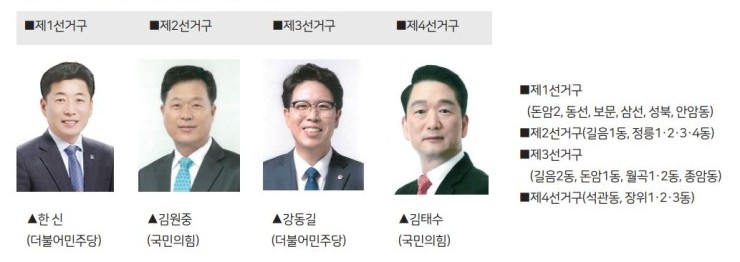 (시사프리신문=김영국 기자) ■ 성북구 서울시의원 당선인 [서울시의원 선거 이모저모] 성북구 서울시의원 선거는 총 4개 선거구에서 치러진다. 제1선거구에서 민주당 한신 전 성북구의원, 제2선거구에서는 국민의힘...
