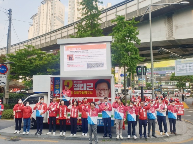 (시사프리신문=김영국 기자) 성북구청장 국민의힘 정태근 후보가 지난 19일 길음역 3번 출구에서 출정식을 가졌다. 오후 5시 30분이 지나자 오세훈 서울시장과 정태근 후보를 지지하는 운동원과 당원을 포함해 일반 주민 1천여 명이 모여 오세훈과 정태근을 ...