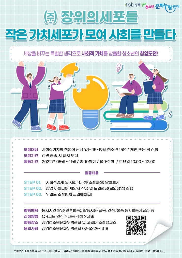 성북구 장위청소년문화누림센터에서 2022년 여성가족부 청소년프로그램 공모사업에 선정되어 청소년 사회참여 활성화 프로그램 ‘㈜장위의 세포들’ 참가자 모집을 시작한다. “㈜장위의 세포들” 프로그램은 사회적 가치와 모의창업에 관심 있는 15세 ~ 19세 청...