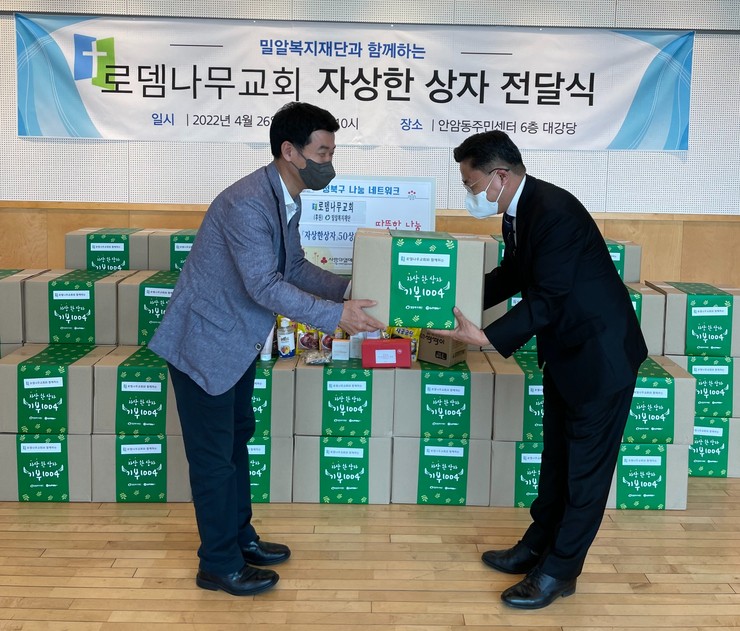 지난달 26일 성북구 안암동 주민센터에는 안암동소재 로뎀나무교회가 사회복지법인 밀알복지재단과 함께 전달한 『자상한 상자』 50상자의 전달식이 열렸다. 『자상한 상자』는 교회가 부활절 주기에 받은 헌금을 재단의 후원품에 더한 약 12만 원 상당의 생필품...