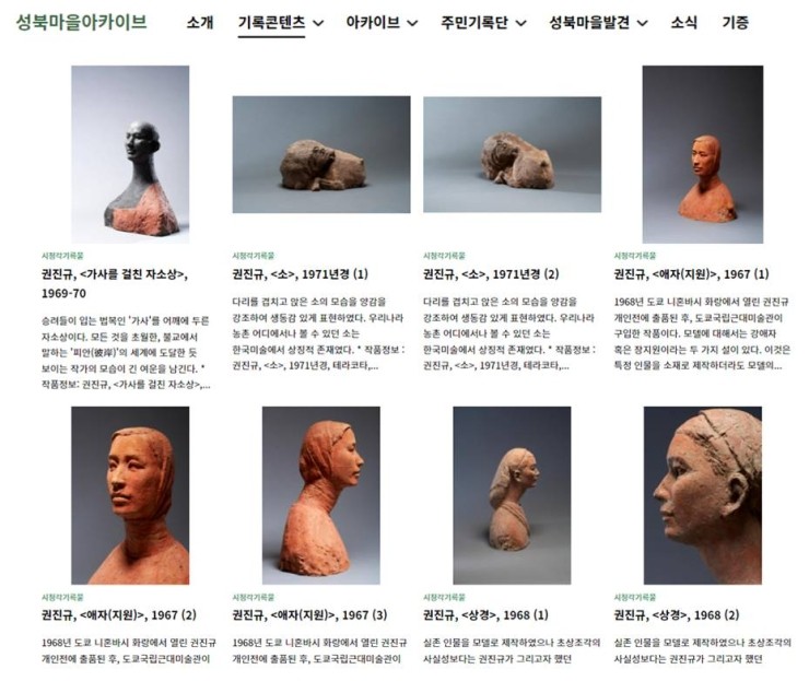 성북구와 성북문화원은 조각가 권진규 탄생 100주년을 맞아 서울 성북구(구청장 이승로)와 성북문화원(원장 조태권)은 지역 아카이브 누리집인 성북마을아카이브(https://archive.sb.go.kr)에 권진규의 작품을 촬영한 다수의 고화질 작품이미지를 공개...