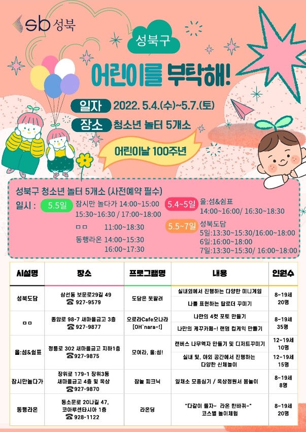 성북구가 ‘어린이날 100주년’이 포함된 5월 가정의 달을 맞아 다양한 전시, 문화·놀이 행사 등을 재개한다. 성북구는 우리나라 최초 유니세프 인증 아동친화도시로서 전국 최초로 2차 상위인증을 준비하고 있는 만큼 구립청소년센터, 어린이공원·도서관·미...