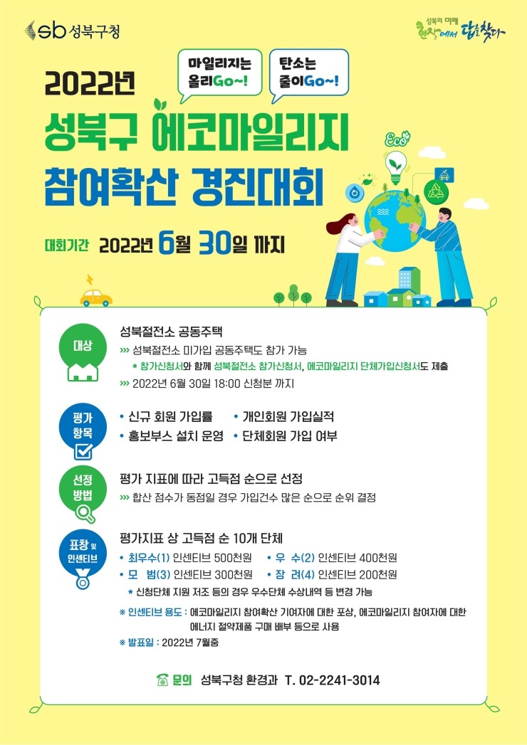 성북구가 ‘2022년 성북구 에코마일리지 참여확산 경진대회’를 개최하고 신규 회원을 모집한다. 이번 경진대회는 2차에 걸쳐 진행한다. 1차는 4월에서 6월까지 관내 공동주택 절전소를 대상으로 개인회원 가입실적 및 가입률, 단체회원 가입 여부, 홍보...