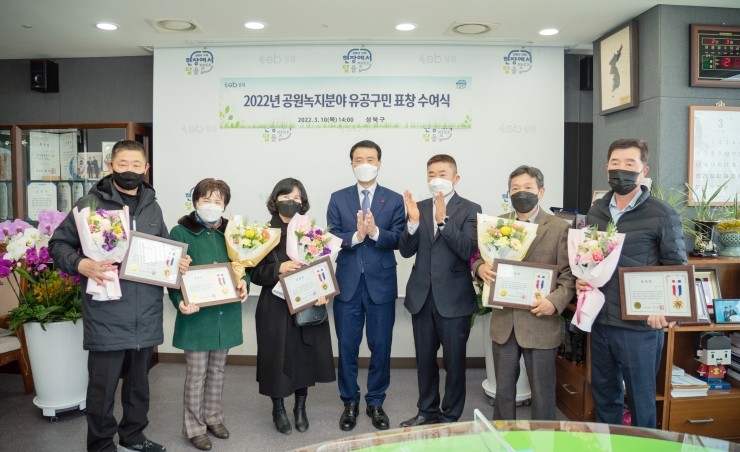 (시사프리신문=김영국 기자) 성북구청에서는 지난 11일 구청장실에서 공원녹지분야에서 활약한 구민 5명에게 유공자 표창을 진행했다. 표창수상자로 선정된 주민은 (주)송정산업개발 직원들과 일반주민으로 북악산 공원 조성에 이바지한 공로를 인정받...
