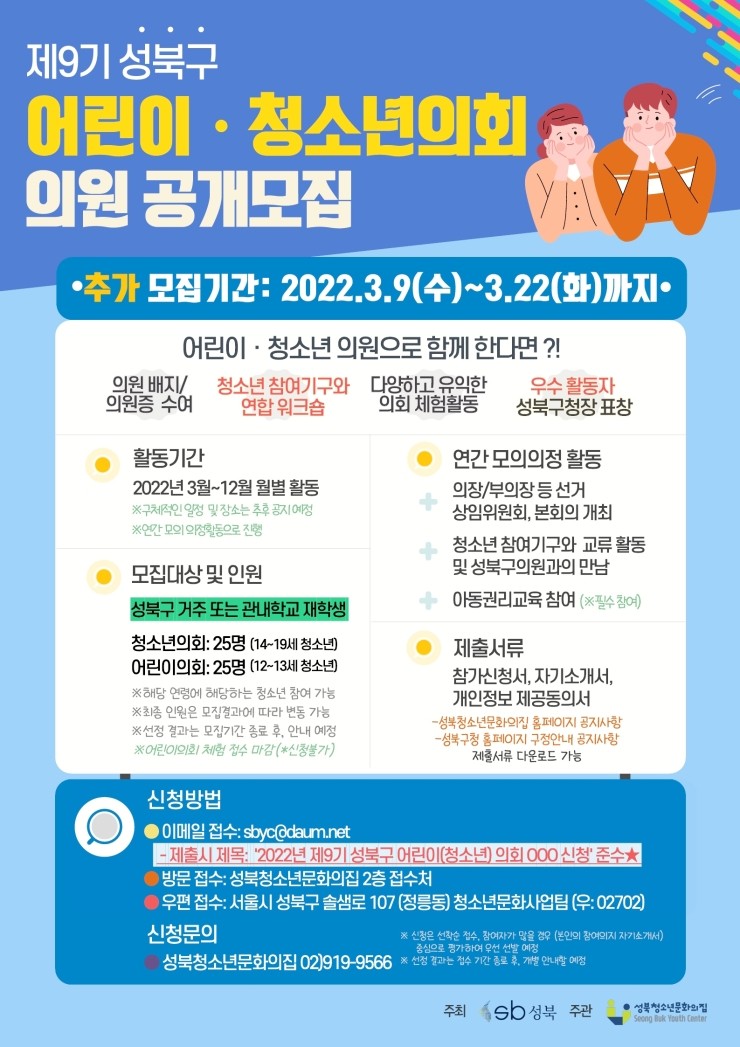 성북구(구청장 이승로)는 제9기 성북구 어린이·청소년의회 의원 공개모집한다. 모집기간은 2022. 3. 9.(수)~3. 22.(화)까지이다. 모집대상은 성북구 거주 또는 관내학교 재학생 (만7세~만18세 아동청소년)이다. 모집인원은 청소년의회 2...