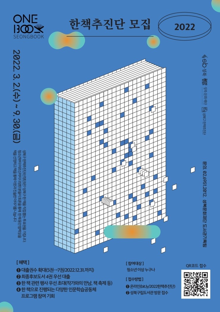 성북구(구청장 이승로)가 2022년 ‘성북구 한 책 추진단(선정단)’ (이하 한 책 추진단)을 모집하고 있다. 한 책 추진단이 되면 성북구 대표 독서 운동인 ‘성북구 한 책 읽기’ 사업에 1년 동안 우선 참여할 수 있다. 그 밖의 주요 혜택으로는 ▲...