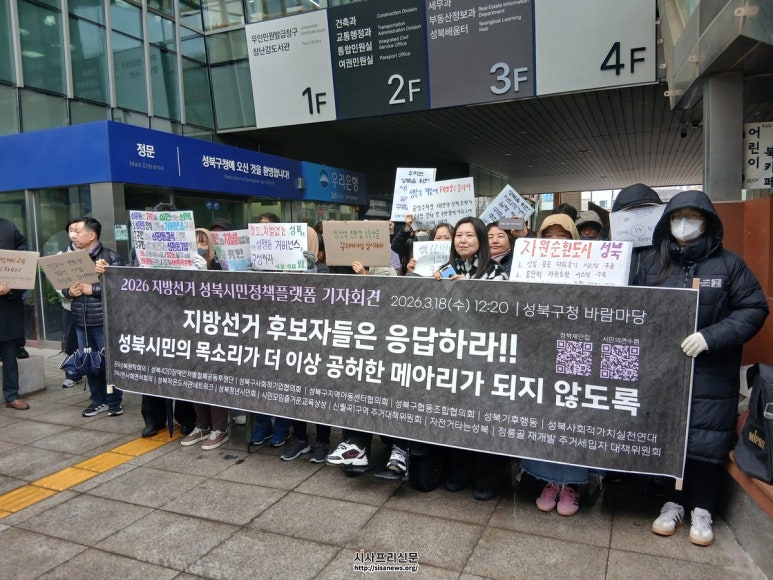 성북구청 앞 ‘시민정책 플랫폼’ 기자회견 “지방선거 후보 응답하라” 성북 14개 시민단체 참여 성평등·자원순환·청년정책 등 제안 성북구청 앞 ‘시민정책 플랫폼’ 기자회견 (시사프리신문=정진만 기자) 지난 3월 18일 낮, 비가 내리는 가운데...