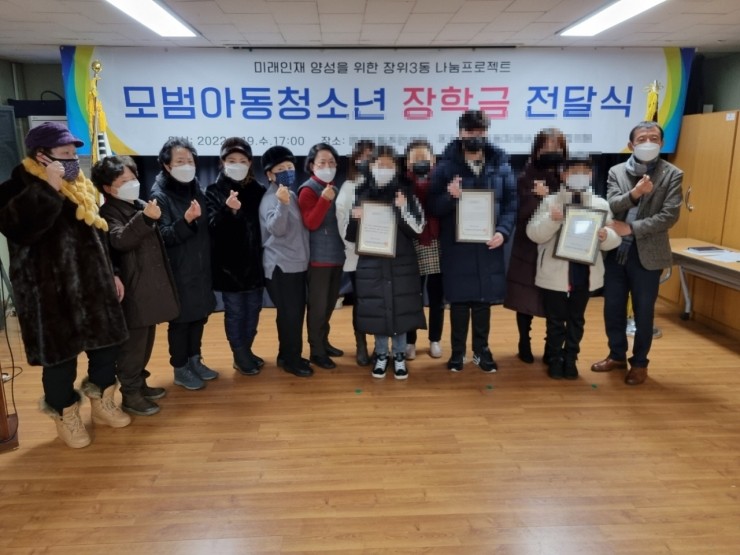 성북구(구청장 이승로) 장위3동지역사회보장협의체(위원장 직무대행 고순자)에서 지난 19일 ‘제3회 모범아동청소년 장학금 전달식’을 개최하고 장학금과 장학증서를 전달했다. 이날 전달된 장학금은 미래인재양성을 위한 장위3동 나눔프로젝트의 일환으로, 평소 솔...