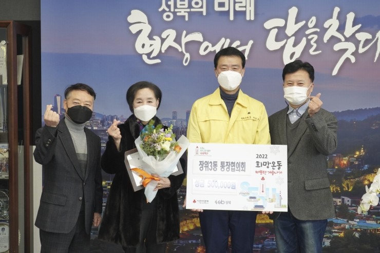 성북구(구청장 이승로)장위3동 통장협의회(회장 박정희)에서는 4일 어려운 이웃들의 따뜻한 겨울나기를 위한 이웃돕기 성금 50만을 구청장실에서 사회복지공동 모금회에 기부하였다. 장위3동 통장협의회 통장들은 지역 봉사자로 장위3동 주민들을 위하여 봉사활동의 ...