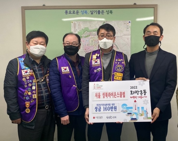 성북구(구청장 이승로) 삼선동 주민센터에는 서울 성북라이온스클럽(회장 조형찬)의 희귀?난치성 질환으로 고통 받고 있는 지역 청년을 돕기 위한 성금 160만 원을 기부가 있어 지난 11월 30일 삼선동 주민센터에서 송재진 삼선동장, 서울 성북라이온스클럽 조형찬...
