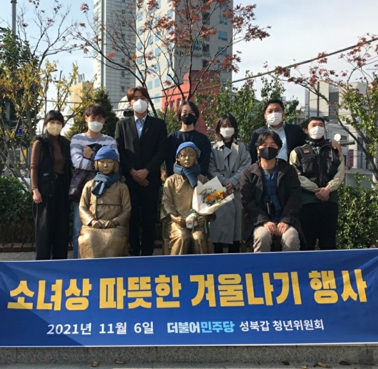 더불어민주당 성북(갑)지역위원회(지역위원장 김영배 국회의원)의 청년당원들이 지난 6일 성북구 한성대입구역 분수마루광장에서 일본군 ‘위안부’ 추념을 위한 ‘한․중 소녀상 기림비 겨울나기 행사’를 진행했다. 행사에 참여한 청년당원들은 한․중 소녀상 기림비에 모자와 목...
