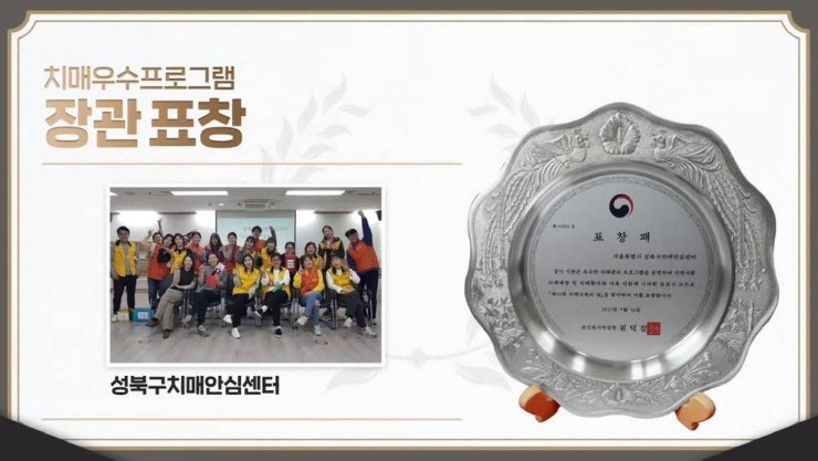 성북구(구청장 이승로)치매안심센터가 제14회 치매극복의 날 기념행사에서 치매 우수프로그램 운영 분야 우수기관으로 선정돼 보건복지부 장관상을 수상했다. 이번 표창은 우수한 프로그램을 운영한 치매안심센터를 선정해 수여하는 상으로, 시상식은 코로나19로 인해 ...