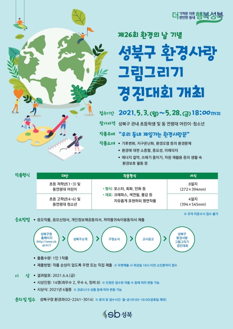 성북구(구청장 이승로)가 오는 6월 5일 제26회 환경의 날을 맞이해 ‘성북구 환경사랑 그림그리기 경진대회’를 비대면으로 개최한다. 미래의 꿈나무 어린이·청소년들을 대상으로 환경에 대한 중요성을 알리고 환경보전에 자발적인 참여를 유도하기 위해 열리는 ...