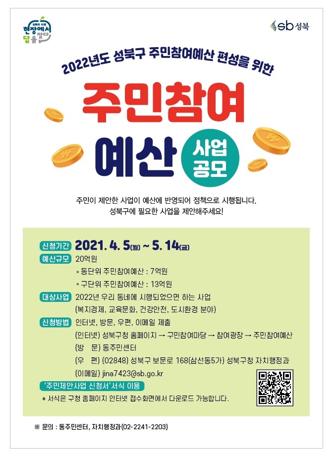 성북구(이승로 구청장)가 2021년 성북구 주민참여예산 제안사업 공모를 진행해 5월 14일까지 신청을 받는다. '주민참여예산제'는 주민이 예산사업의 제안에서부터 심사, 결정에 이르기까지 전체적인 과정에 직접 참여해 주민의 권리의식과 재정운영의 투명성...