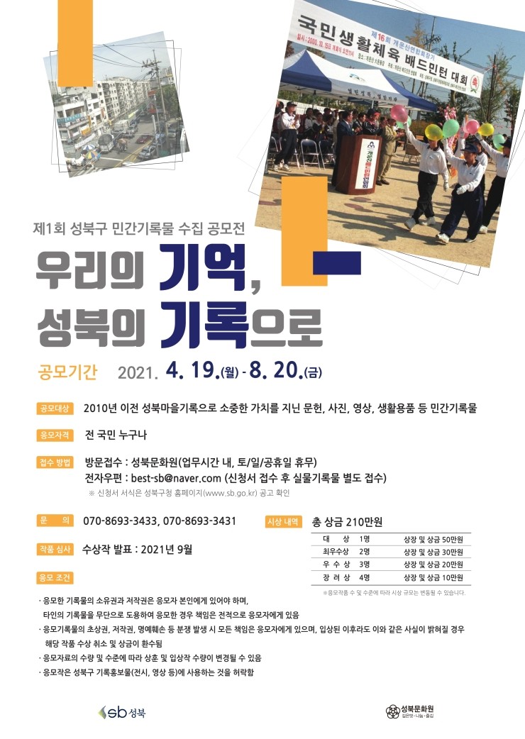 성북구와 성북문화원이 지역의 변천과 생활상이 담긴 기록을 찾기 위해 민간기록물 수집 공모전을 연다. 이번 공모전은 4월 19일부터 8월 20일까지 진행되며, 2010년 이전 성북구 마을기록으로의 소중한 가치를 지닌 문헌, 사진, 영상, 생활용품 등을...