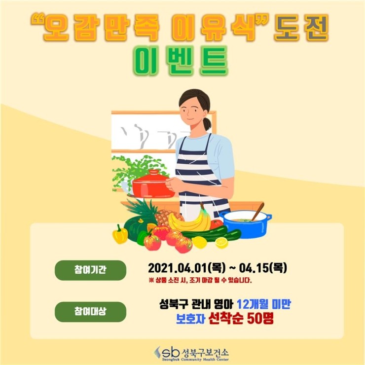 성북구(구청장 이승로)가 12개월 미만의 영아 양육자들에게 올바른 이유식 정보 제공을 위해 새롭게 ‘오감만족 이유식 도전 이벤트’가 좋은 반응을 얻고 있어 눈길을 끌고 있다. 코로나19가 장기화됨에 따라 생활 속 거리두기로 인해 가정에서 건강한 식생활 실...