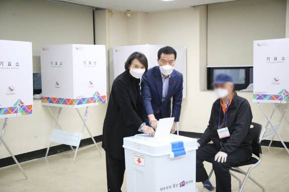 이승로 성북구청장이 지난 3일 아내 임명숙 씨와 함께 성북구 석관동 주민센터 2층 회의실을 찾아 서울시장 보궐선거 사전투표를 했다. 이날 비가 내리는 궂은 날씨에도 불구하고 석관동 주민센터는 투표소를 찾은 시민들의 발길로 북적였다. 손 소독 후 위생...