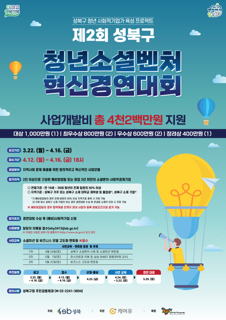 성북구가 지역사회 문제를 창의적이고 혁신적인 방법으로 해결 할 청년 사회적기업가 육성을 위해 「청년 소셜벤처 혁신경연대회」 참가팀을 모집한다. 「청년 소셜벤처 혁신경연대회」는 사회변화를 꿈꾸는 청년들의 참신하고 역량 있는 아이디어를 공모하여 경연대회를 통...
