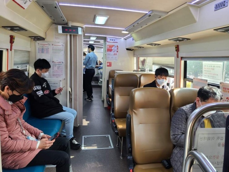 성북구(구청장 이승로)가 지난 19일 ‘사랑의 헌혈운동’을 벌여 생명나눔에 힘을 보탰다. 성북구청 앞에 마련된 헌혈버스 안에서 참여자들이 헌혈 전 전자문진 등을 하며 대기하고 있다. 이날 헌혈행사 전 희망자를 신청 받아 대기 인원을 최소화하고 방역수칙을 철저...
