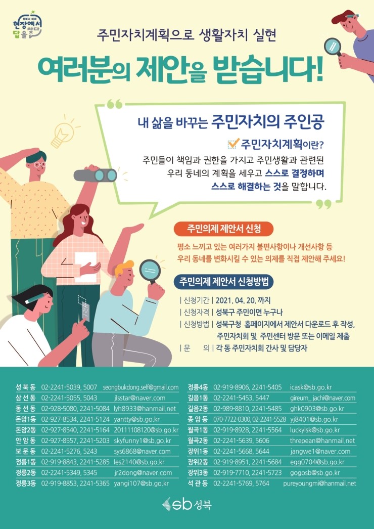 ‘생활자치 1번지’ 성북구(구청장 이승로)가 주민주도의 주민자치계획 수립을 위한 주민의제 사업제안서를 4월 20일까지 접수받는다. 주민자치계획이란 주민자치회의 사업계획을 정하는 것으로, 주민이 모여서 동네의 문제를 찾아내 해야 할 일을 찾고 스스로 해결 하는 ...