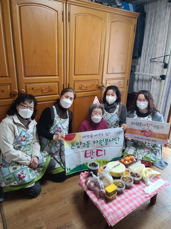 돈암2동(동장 권순자)에서는 지난 11일 자원봉사단 ‘반디’가 생신을 맞이한 홀몸 어르신들을 위해 생신 상을 차려드리고, 선물을 전달하는 따뜻한 활동을 가졌다. 지난 11일은 한 달에 한 번씩 생신을 맞이한 홀몸어르신들을 위한 생신파티가 열리는 날이다. 자...