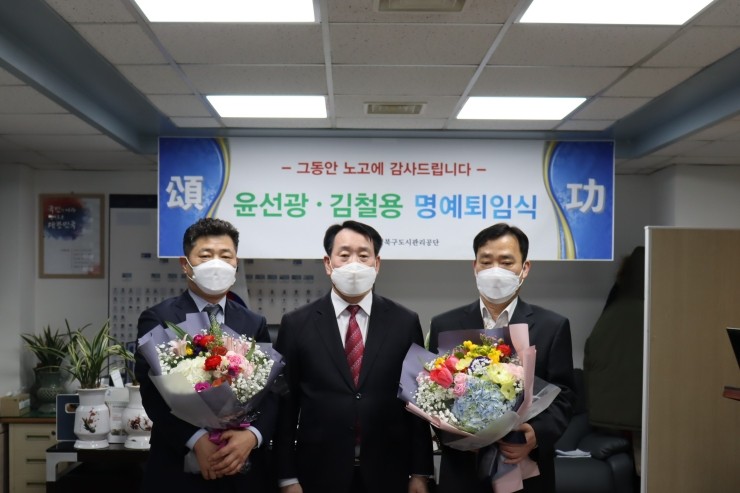 성북구도시관리공단(이사장 박근종)은 지난 4일 공단 본부 이사장실에서 비대면으로 윤선광, 김철용 팀장에 대한 명예 퇴임식을 가졌다. 공단에서 처음으로 진행된 명예 퇴임식에는 코로나 상황으로 많은 직원이 직접 모이지는 못했지만, 온라인으로 임·직원 100여...