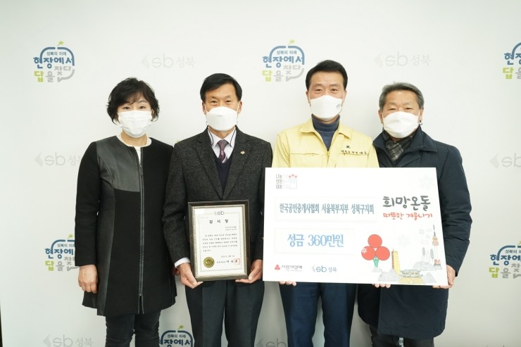 한국공인중개사협회 서울북부지부 성북구지회(지회장:김종빈)가 지난 5일 ‘희망온돌 따뜻한 겨울나기’ 성금 360만원을 기탁해 어려운 이웃에게 훈훈한 마음을 전했다. 한국공인중개사협회 서울북부지부 성북구지회는 1986년 결성되어 현재 880여명의 회원으로 구성되어...