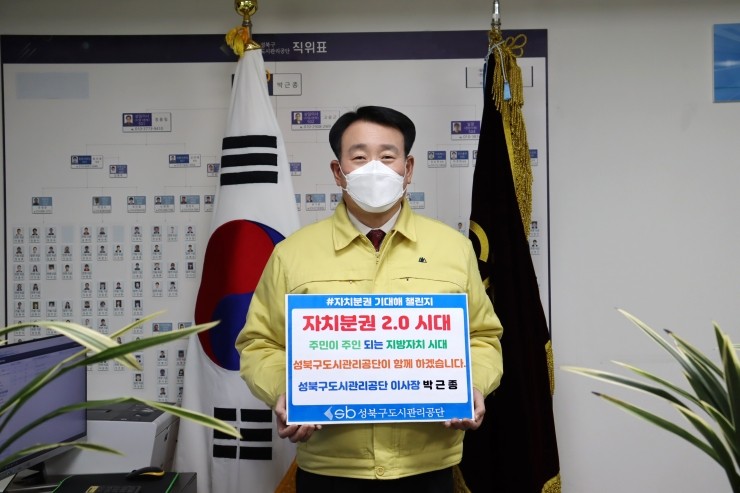 성북구도시관리공단 박근종 이사장이 지난 2일 자치분권 2.0시대 개막을 응원하는 ‘자치분권 기대해 챌린지’에 동참했다. 이번 챌린지는 지난해 12월 9일 「지방자치법」 및 「자치경찰법」개정법률안이 국회를 통과함에 따라 주민 중심 자치분권 실현 소망 ...
