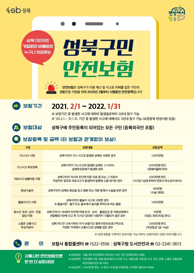성북구(구청장 이승로)가 지난해 이어 올해도 ‘성북구민 안전보험’을 운영한다. 보장한도는 최대 1천만 원이다. 작년부터 시행된 ‘성북구민 안전보험’은 구민들이 각종 재난사고로 인한 사망사고 또는 후유장애 발생시 등 어려움을 극복할 수 있도록 하는 일종의 ...