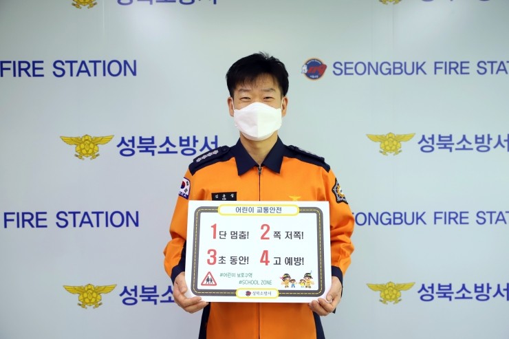 김윤섭 성북소방서장은 어린이보호구역내 교통안전 실천문화 정착을 위한 ‘어린이 교통안전 릴레이 챌린지’ 동참했다. 김윤섭 서장은 이승로 성북구청장의 바통을 이어받아 참여했으며 피켓에는 소방캐릭터인 ‘영웅이’와 ‘1단 멈춤! 2쪽 저쪽! 3초 동안!...
