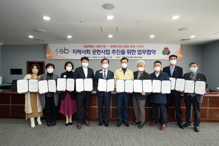 성북구(구청장 이승로)가 지난 11월 16일 국제라이온스협회354-C지구(총재 허재갑)와 지역사회공헌활동 업무협약을 체결했다. 이번 협약을 통해 성북구와 국제라이온스협회354-C지구, 동주민센터 그리고 클럽 간 지역사회보장 활동의 협력을 더욱 견고히 다지...