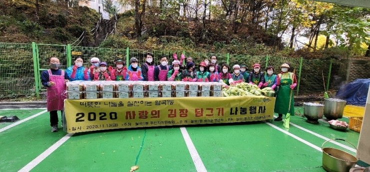 성북구(구청장 이승로)월곡1동 주민자치위원회(위원장 최용상)에서는 2020 사랑의 김장담그기 나눔 행사를 월곡1동 새마을부녀회(회장 김소자)의 주관, 복지협의체(위원장 차복자) 후원으로 지난 13일 월곡1동 주민센터 주차장에서 주민자치위원회 위원, 새마을 부...